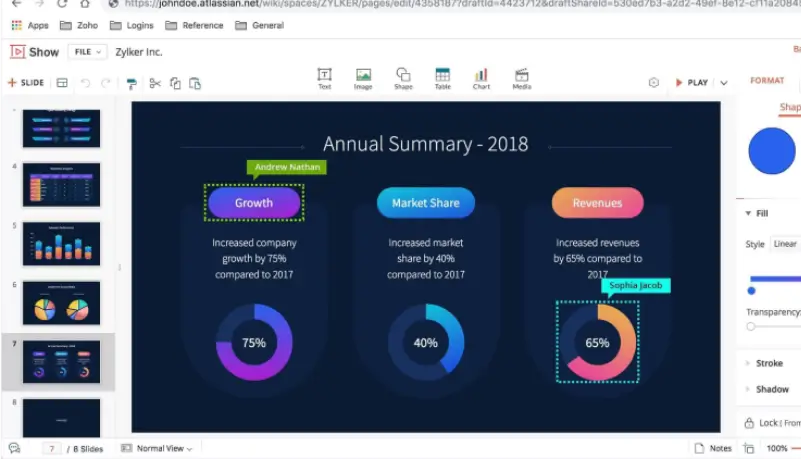 Zoho Show enables real-time collaboration, allowing team members to edit slides together, leave comments, and refine content from anywhere. With easy sharing options and browser-based access, your presentations stay updated, accessible, and ready to impress clients, partners, or internal teams.